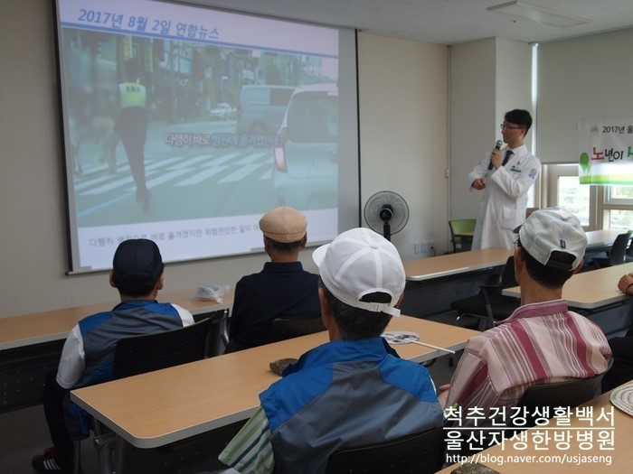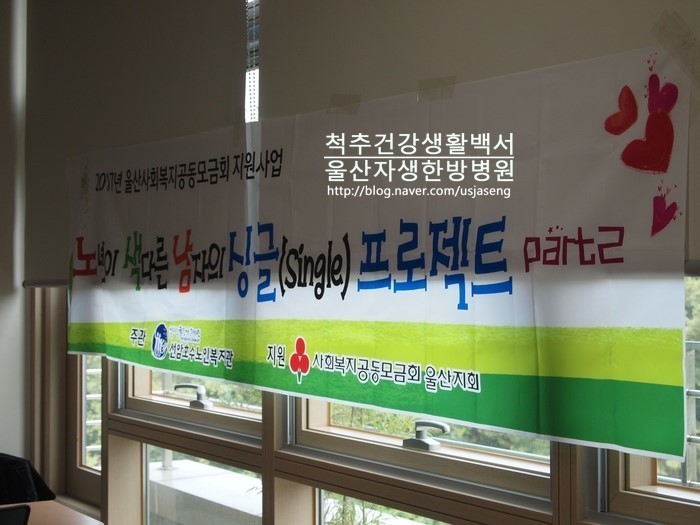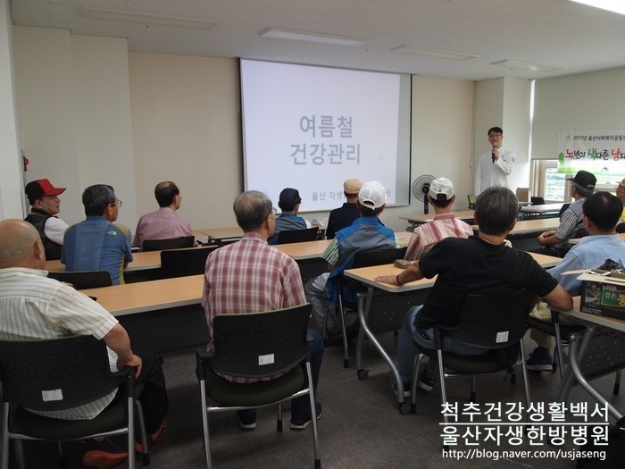 2017년 8월 8일, 울산시 사회복지공동모금회 지원사업의 일환으로 조한신 원장님께서 울산 자생한방병원을 대표해 선암호수노인복지관에서 혼자 사시는 남자 어르신들을 대상으로 한 '노년이 색다른 남자의 싱글 프로젝트' 건강강좌를 진행했습니다.
