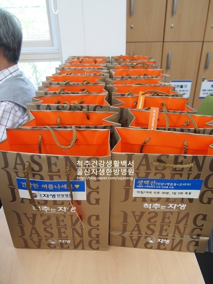 강좌를 마무리하며 여름철 기력이 부족하실 어르신들을 위해 여름철 건강 보약 생맥산을 선물로 나누어드렸습니다.